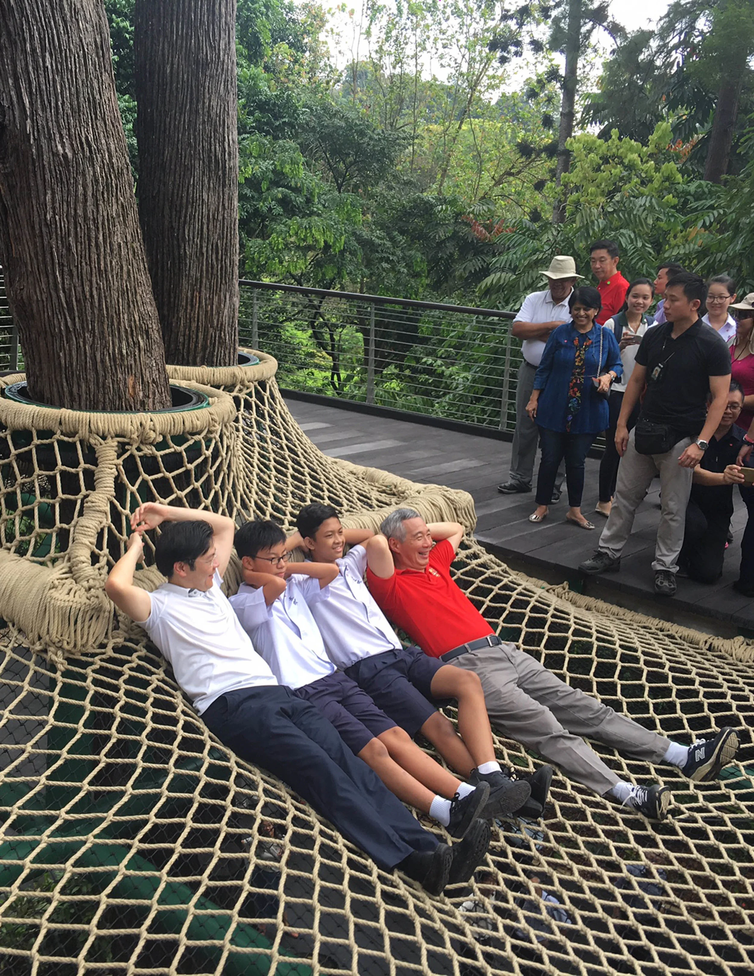 The Prime Minister and Minister of National Development relaxing for the Press at the Canopy Web in the Learning Forest SBG - by Stephen Caffyn Landscape Design