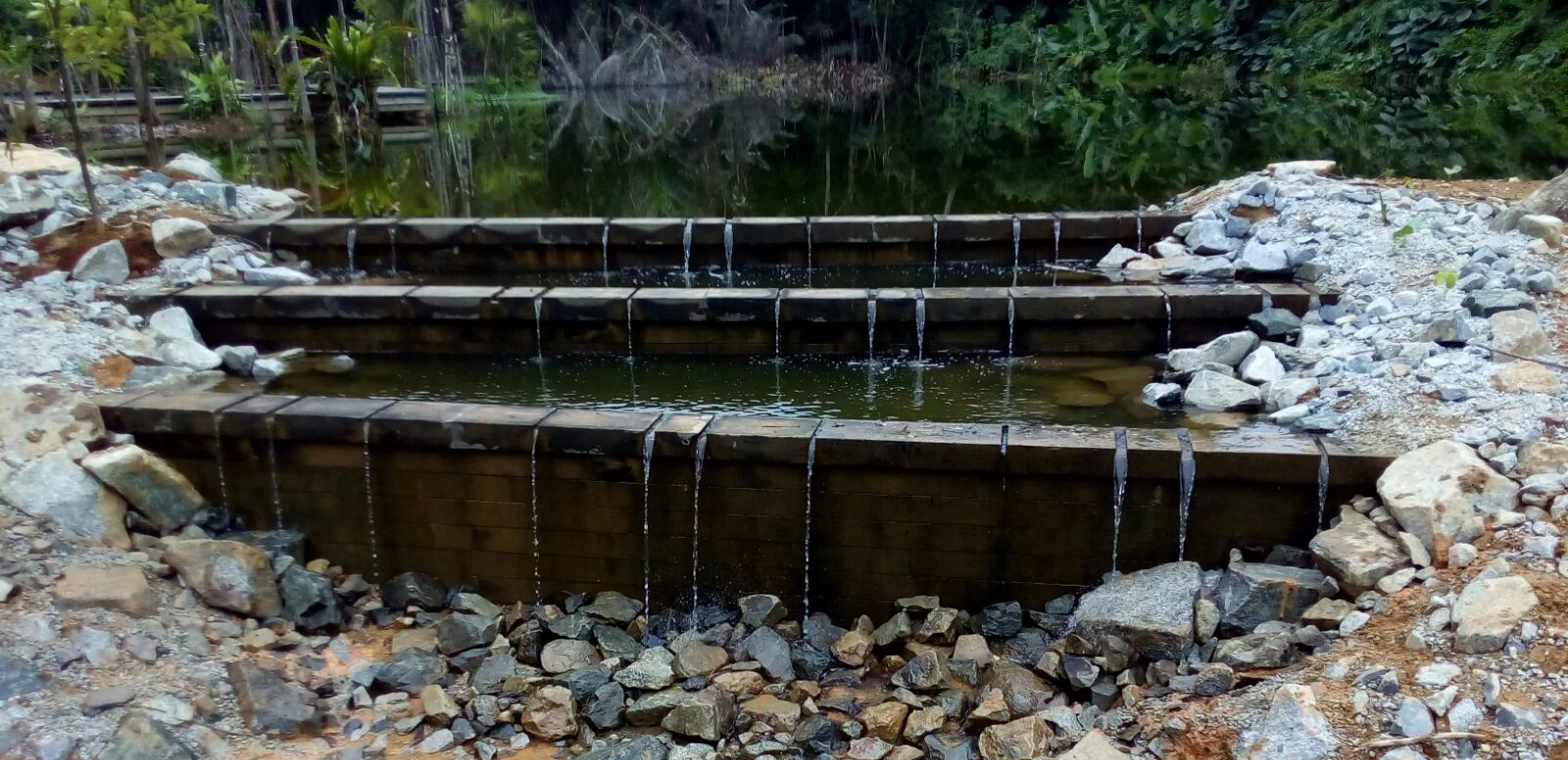 Weirs - The weirs in the project stabilise the water levels for the various water-bodies and regulate outflow while also providing an attractive visual feature at key locations such as the Botanists Boardwalk.