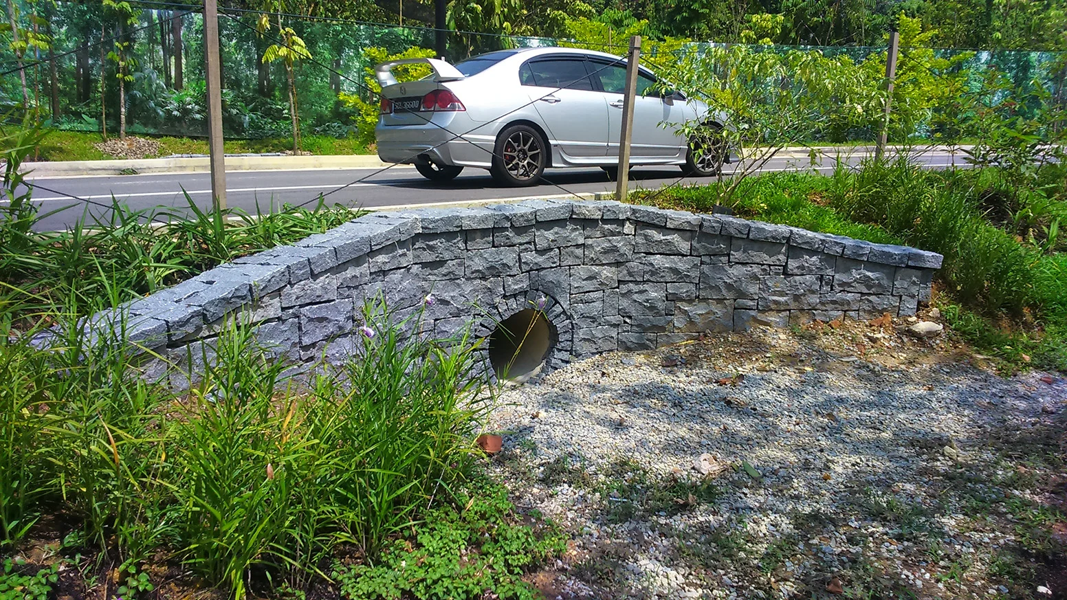 Stone clad culvert conveying water from the coach park area through to the wetland cell for treatment prior to discharge into the lower wetland lake