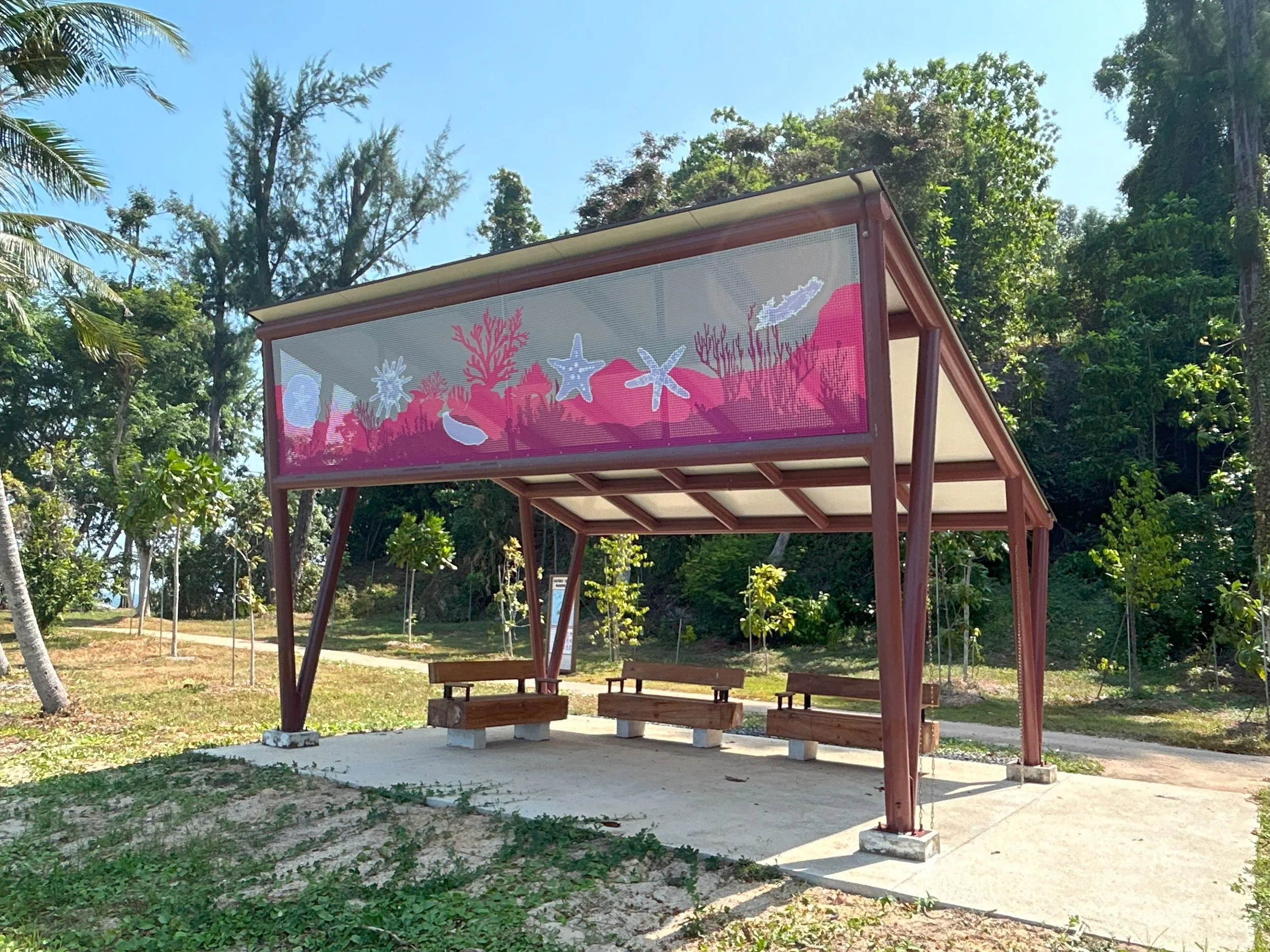 Each shelter features a perforated panel displaying various marine species found around the Sisters Islands. With unique colours and marine animal graphics, the shelters are visually distinctive and engaging, offering another opportunity for visitors to learn about local marine biodiversity.