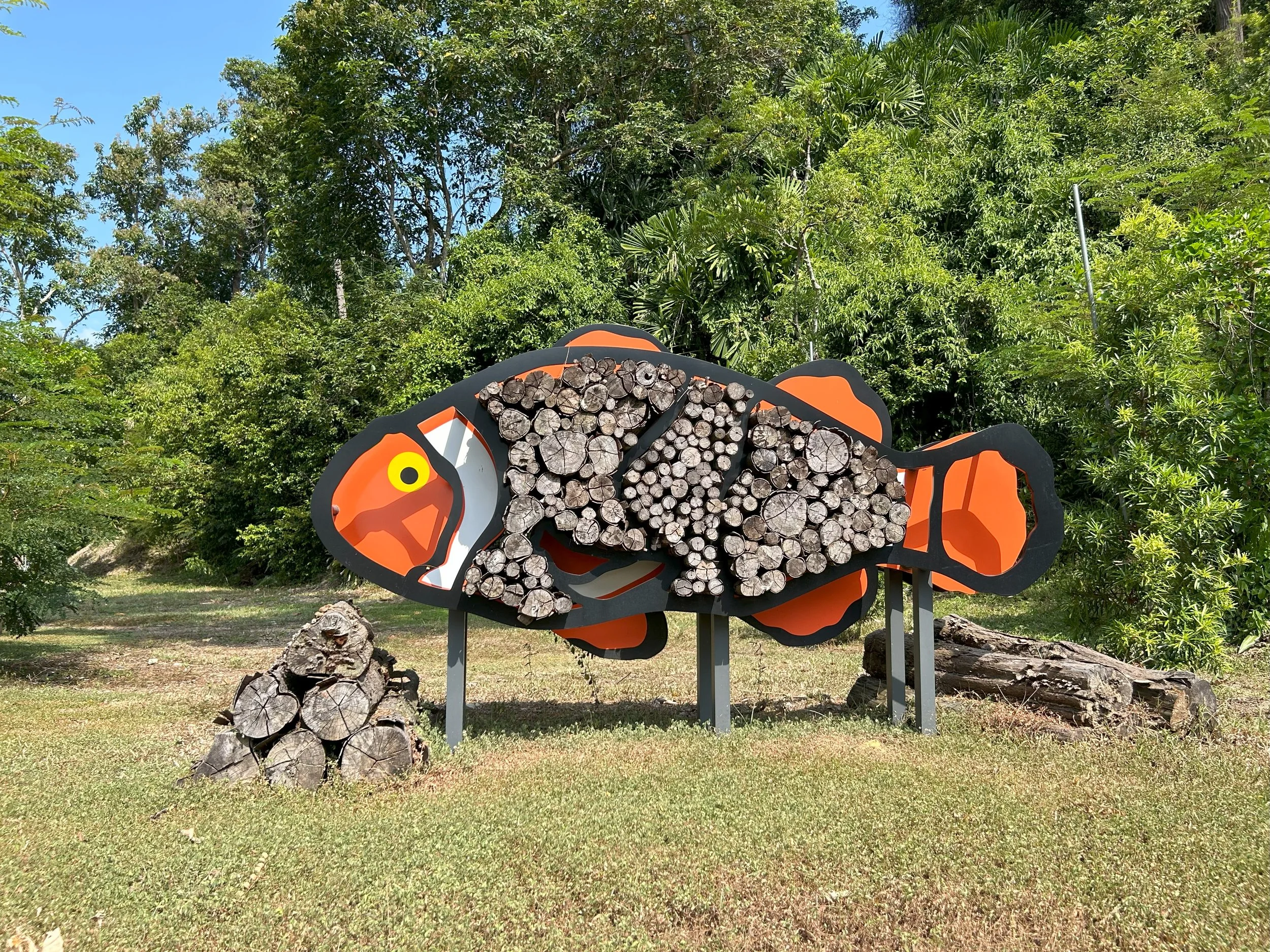 An elaborate Wildlife Pile or Wildlife Resort is designed as a sculptural element in the form of a clown fish. The logs used are from fallen trees and branches.