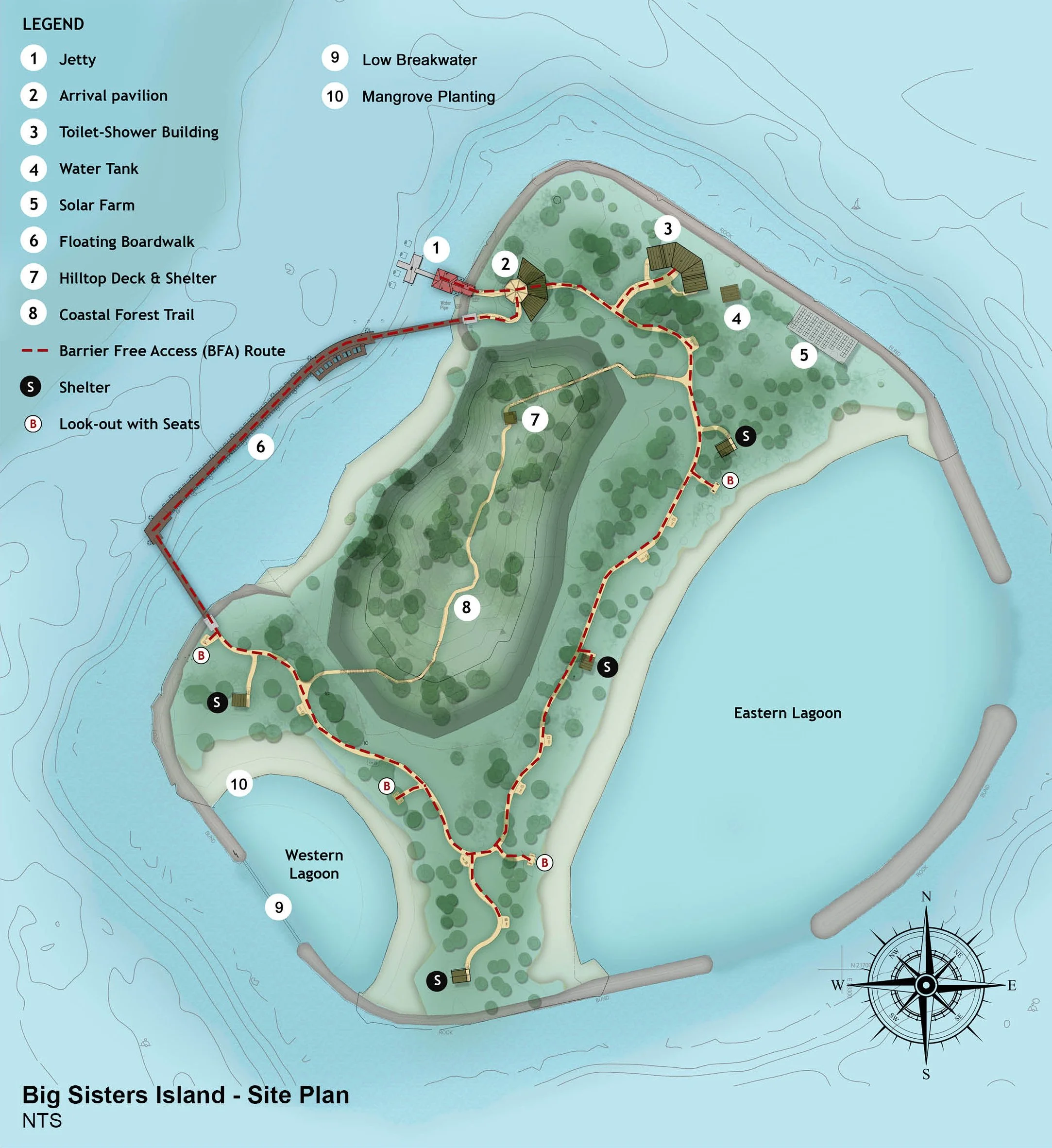 The existing western lagoon has been converted into a huge tidal pool through the design and construction of a low breakwater wall across the lagoon entrance. This is designed to allow retention of sea water during low tides to promote growth of the mangroves which have been planted and to enable future natural recruitment of mangrove propagules.