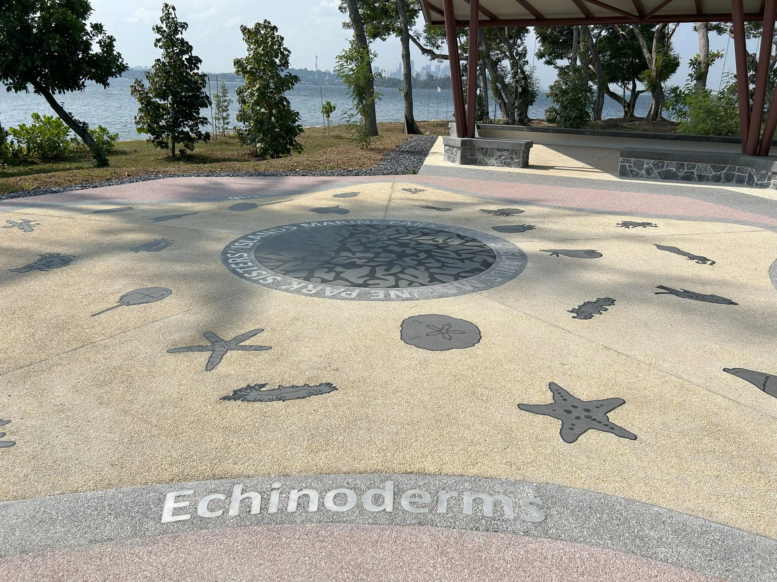 The Arrival Plaza flooring depicts the diverse marine life to be found in the waters of the Marine Park in stone inlays. The design of the arrival plaza and pavilion was inspired by the five-part radial symmetry of echinoderms such as sea stars, and sand dollars.